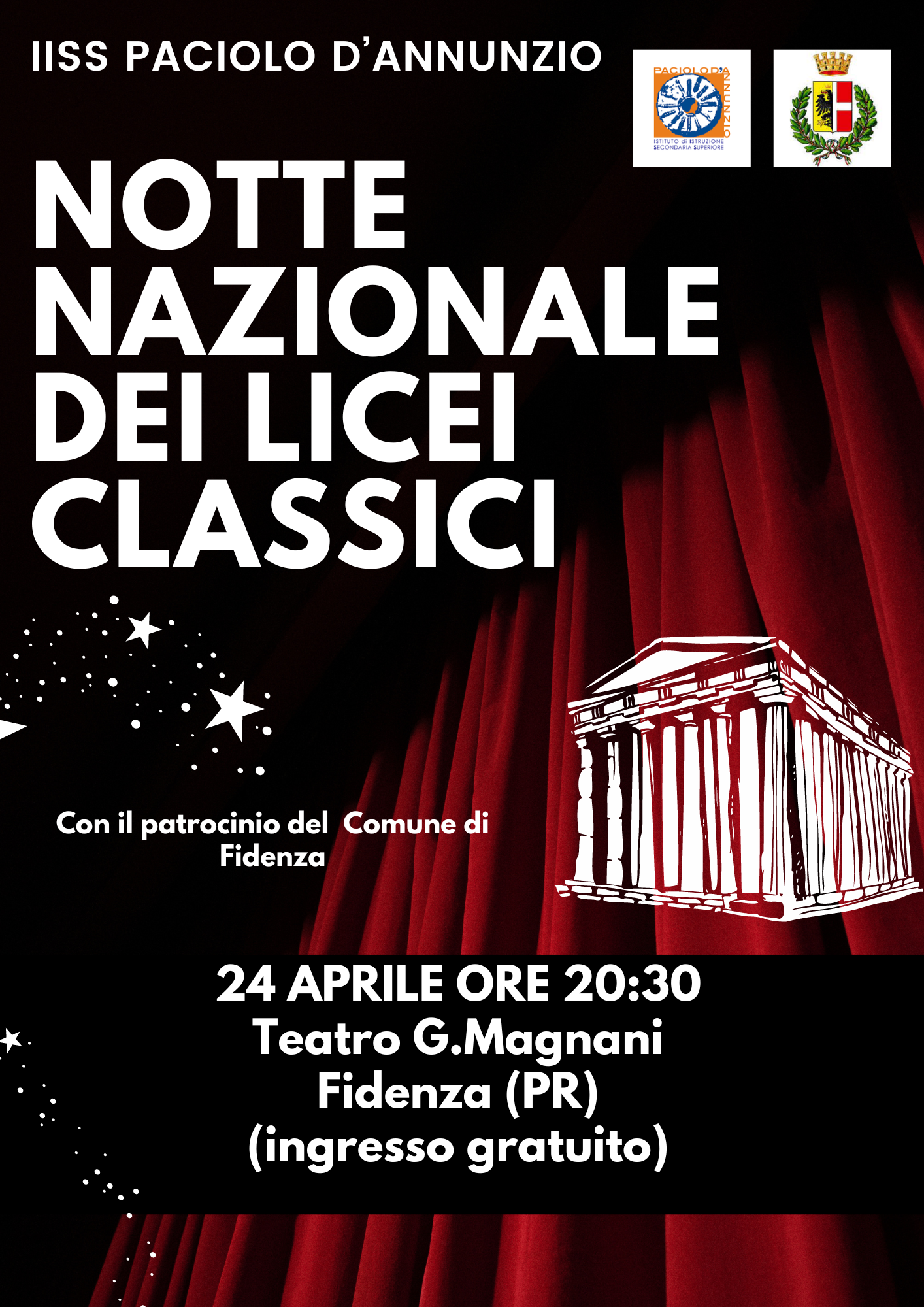Anche quest’ anno il nostro istituto partecipa alla Notte Nazionale del Liceo Classico, manifestazione nata per evidenziarei il valore culturale e la validità educativa di questo percorso di studi. Purtroppo, per motivi organizzativi e logistici, la nostra serata si terrà in una data diversa da quella deliberata a livello nazionale, ma ciò non toglie che essa rappresenti un’occasione importante di riconoscibilità e vivacità dell’istituto di fronte alla cittadinanza, di partecipazione attiva e creativa degli studenti alla vita scolastica al di fuori dell’ambito strettamente curricolare, nonchè di collaborazione empatica fra questi ultimi e i docenti. Il filo comune attorno al quale ruoteranno tutte le attività previste durante lo spettacolo è quello della “Comunicazione” e sul palco si alterneranno momenti di recitazione, di danza e di canto, traendo spunto sia dalla conoscenza della cultura classica sia da tematiche più attuali di carattere sociale e civile. Invitiamo tutti coloro che vogliano trascorrere due ore di piacevole riflessione a presenziare, sicuri che il desiderio dei nostri ragazzi di essere protagonisti e di mettersi in gioco non vi deluderà.