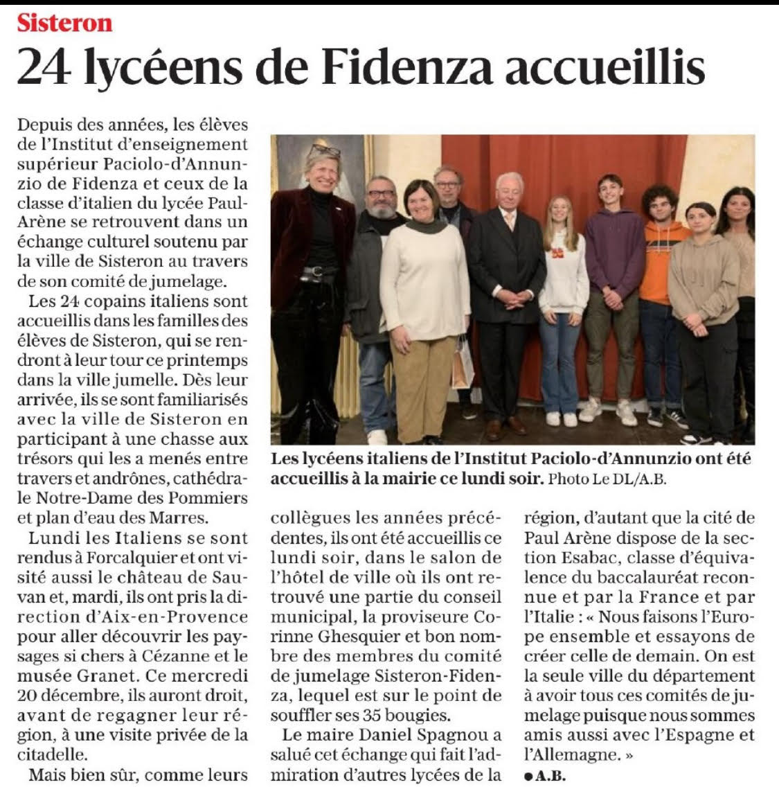 Oltre alla partecipazione a lezioni del corso Esabac italiano/francese i nostri studenti hanno visitato non solo la cittadina di Sisteron ma anche Aix en Provence, Marseille, la famosa Maison de cosmétique et parfumerie l'Occitane e l'ultimo giorno hanno festeggiato mangiando crepes e pattinando sul ghiaccio con gli amici francesi. L'esperienza ha previsto l'incontro con il comitato di gemellaggio e i saluti del Sindaco di Sisteron. I nostri studenti hanno vissuto anche un momento di notorietà quando la televisione locale li ha intervistati e quando sul quotidiano La Provence è apparso un articolo che sottolinea l'importanza di uno scambio che dura da ben 35 anni!